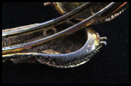 A vintage signed Art, Arthur Pepper gold-tone snake bangle with turquoise bead decoration having red rhinestone eyes completed with clip clasp and safety chain. Signed Art. Diameter approx 2.5 inches.