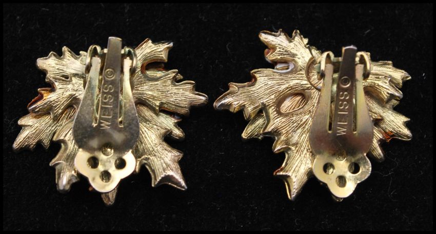 A vintage signed Weiss gold-tone figural enamel decorated Maple leaf brooch and earring set. Brooch measures 3 inches.