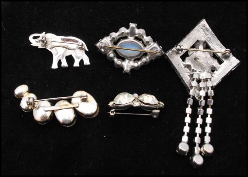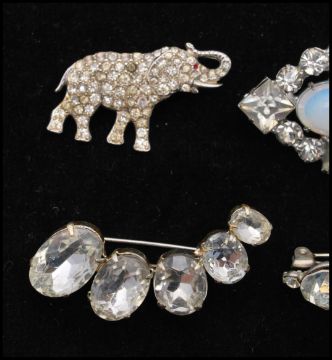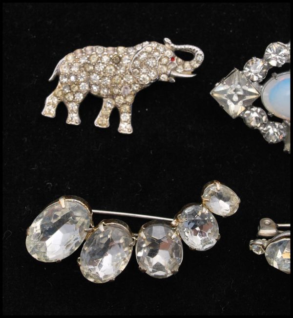 A collection of vintage paste brooches to include an elephant, faux opal and dangle brooch. Largest brooch measures 3 1/4, smallest 1 inch.