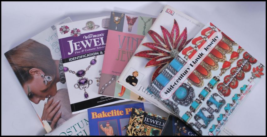 A collection of 10 Jewellery reference books to include; Bakelite pins Schiffer, Price Guide to Costume Jewelery, Jewelery Clare Philips, 100 Years of Collectable Jewelery Baker, Costume Jewellery Claire Miller, Millers Costume Jewellery Steven Miners, Mid-century Plastic Jewellery Schiffer, Vintage Jewlery design Caroline Cox, Warman's Jewellery, Vintage Jewellery Sourcebook.