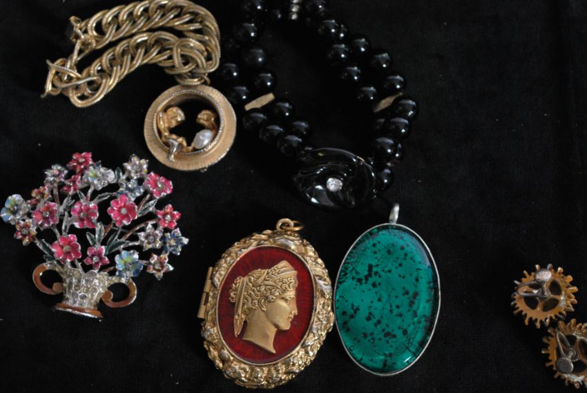 An assortment of vintage costume jewellery, beads and fittings. To include a large enamelled locket pendant signed Art, vintage brooches, earrings, bracelets, necklaces, a paste set buckle and other, contained in a vintage metal William Crawford and Sons biscuit tin.