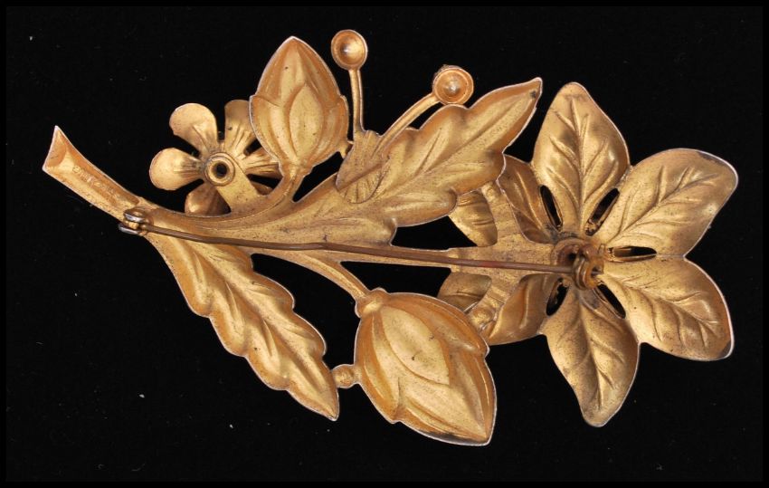 A 1950s oversized gold washed sterling silver flower spray brooch marked Sterling together with a vintage silver and blue enamel pixi / elf brooch pin set in an enamelled shell. Total weight 24.2g. Brooch measures 3 3/4 inches, pixi brooch measures 3/4 inch.