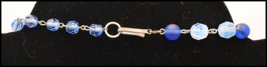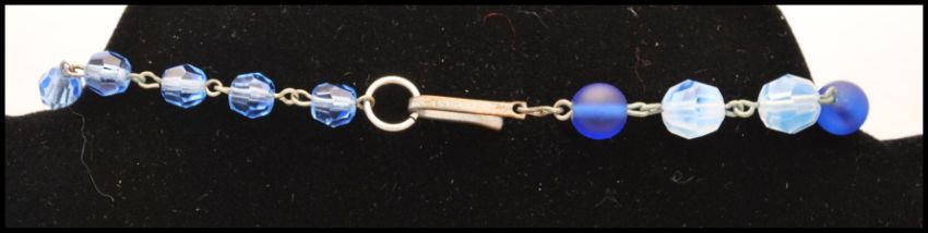 A signed West German three strand glass bead necklace strung with opaline, blue and blue grey glass beads. West German Made stamped to clasp. Measures 19 inches.