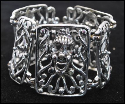 A 1920s Egyptian revival green cabochon bracelet with hook clasp and ball finial. Measures 7 1/2 inches.
