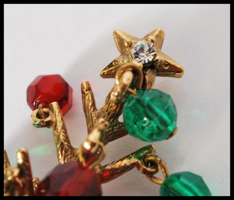 A signed Hollycraft gold-tone Christmas tree brooch pin set with a rhinestone and glass baubles. Measures