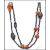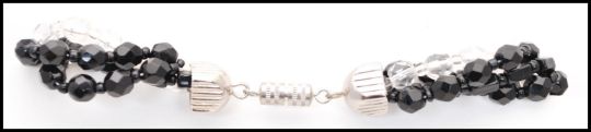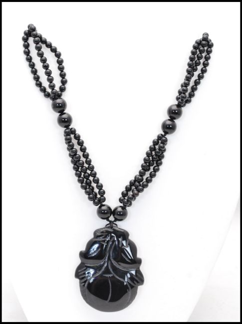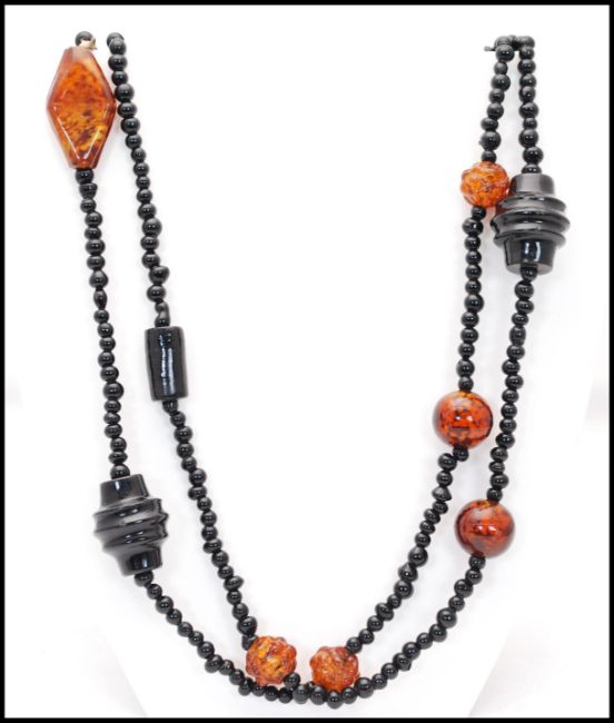 A 1930s vintage French jet black glass necklace strung with amber art glass beads together with a black glass twin strand pendant necklace with squash blossom pendant and two others. x4. Longest measures 50 inches, smallest measures 18 inches.