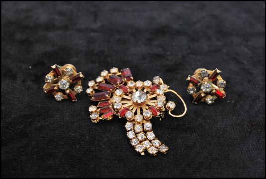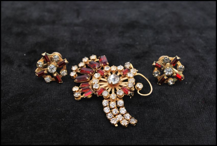 1920s signed vintage Bugbee and Niles gold filled brooch and earrings sets having blue and white and red and white rhinestones. Signed BN 1.20 12k gold filled. Largest brooch approx 2 inches.