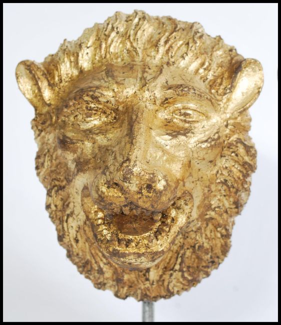 A pair of 20th century carved wood gilded lion head lamps with on modern square metal bases. Measures 30 cm high.