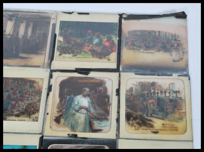 A rare collection of Fry's pure concentrated cocoa magic lantern slides featuring images of chocolate making in factories and depicting the picking and growing of cocoa, possibly for recruitment, with colour added by hand. 16 slides in total. measures: 8cm high x 8cm wide.