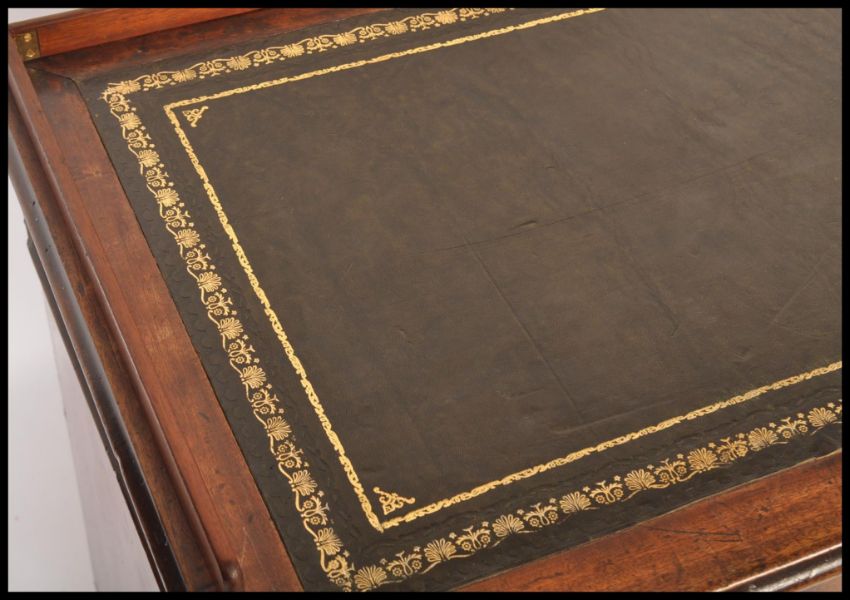 A 19th century Victorian solid mahogany campaign twin pedestal desk. Each pedestal with a bank of drawers having inset brass campaign handles. The tops of each pedestal with the brass swivel clasps. Above a desk top with further drawers inset, green tooled leather writing skiver with stub gallery surround that removes ( see images ) Dismantles into 3 pieces. Measures 73cms high x 112cms wide x 59cms depth