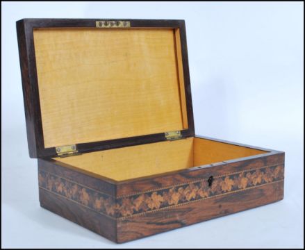 A 19th century Victorian micro mosaic inlaid rosewood workbox with detailed mosaic of Eridge Castle. The borders with foliate design, hinged top with open interior.  Measures 8cms x 23cms x 15cms
