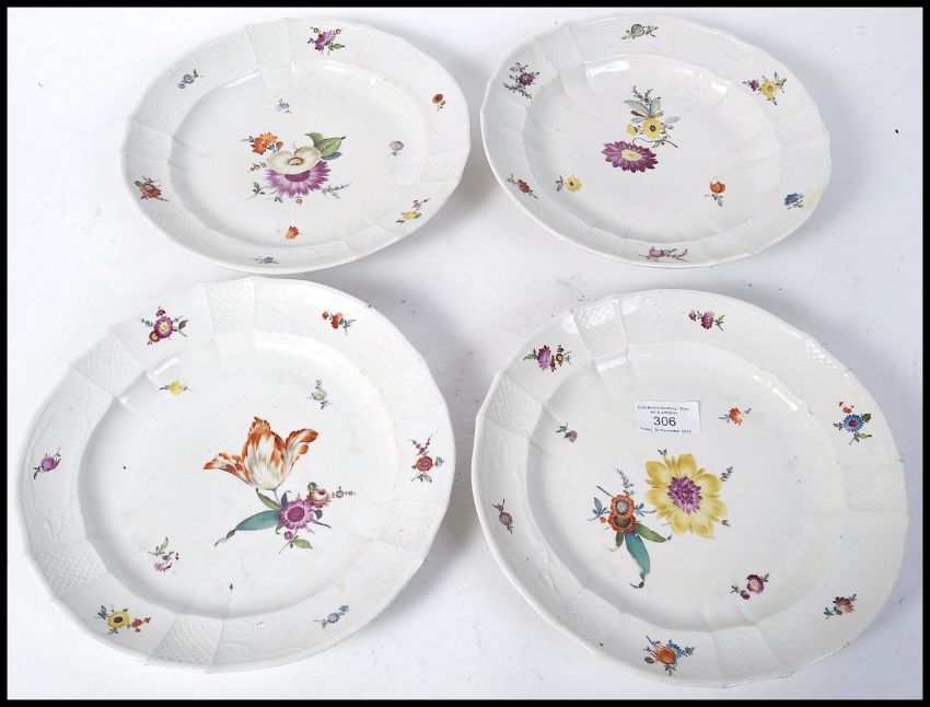 A set of 4 18th century continental German Furstenburg plates x 3 along with a bowl. Each plate with distinctive handpainted foliate sprays. Underglaze blue mark to verso. Measures 24cms diam