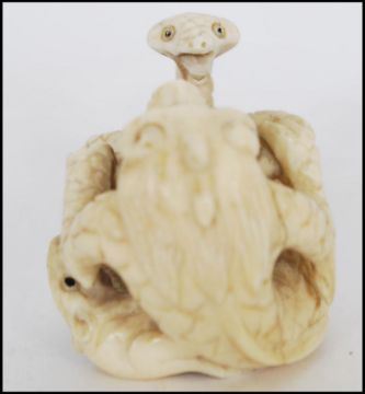 A rare Meiji period ivory Netsuke of a large dragon fighting with a snake and a rat. Signed well to the base. Measures 4cms tall x 5ms long