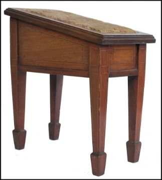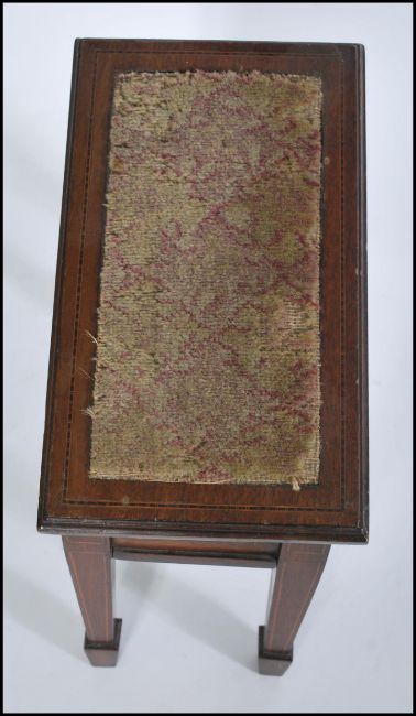 An Edwardian mahogany inlaid shoe shine box - stand. Raised on square tapering legs with spade feet. Angled body with hinged top having original woollen upholstered centre. Meaures 33cms high x 18cms wide x 31cms depth