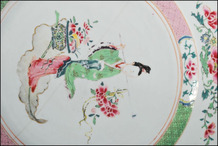 A large 18th century period Chinese Famille Rose / Verte plate charger bowl - Kangxi period (1711-1779)  Painted to the well with Si Wang-mu on a cloud with basket of chrysanthemum's,  the rim with geometric panels and spray's of flowers. Measures 35.5cms diam  ( river repairs ) .