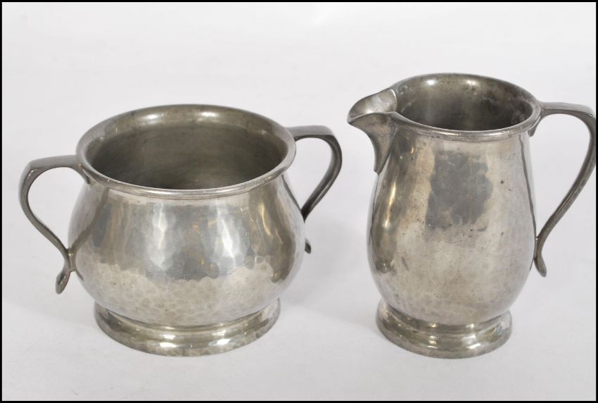 A Tudric pewter cafe au lait / coffee service comprising a coffee pot, water pot, sugar and cream being of beaten planished pewter design. Stamped to base ' TUDRIC PEWTER ' and numbered 01384, Tallest measures 21.5cms high
