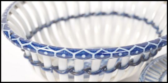 A pair of 18th century Caughley porcelain ribbon chestnut baskets and stands. Each with beautiful underglaze blue willow pattern decoration of farmer, ox and son in front of pagoda. Marked to bases of each. Measures 18cms x 15cms bowls  X 19cms x 16cms stands
