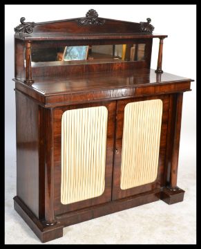 A Good Regency 19th century rosewood chiffonier - pier cabinet having a plinth base with column supports flanking a pair of curtained cabinet doors with shelved interior. Above a mirror back upright with gallery supports and shelf. The back with impressed George V stamp, this item believed to be from a government building measures 138cms high by 115wide by 49 deep