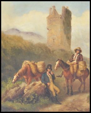 Irish School - Circle of Thomas Sautelle Roberts ( 1760 - 1826 ) An 18th century Irish oil on canvas painting depicting a castle, possibly Ross Castle, Killarney, with peasants and horses resting and drinking at a river. Signed with a painted bird to the lower right corner and framed. Measures 107cms  x 78cms ( frame ) / canvas 89cms x 61cms
