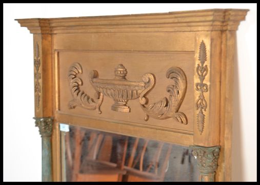 A classical 20th century antique revival twin candelabra overmantel wall mirror having gilded columns and frame complete with scrolled candle sconces. Measures 103 cm x 78 cm.