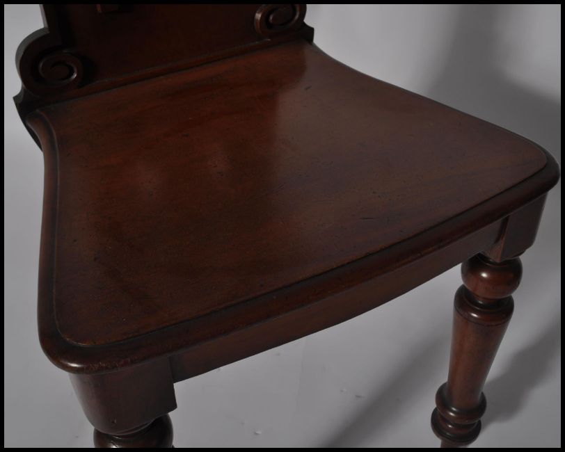 A 19th century Victorian mahogany hall chair raised on turned legs having a fret pierced back rest with scrolled decoration and inverted finials. Central star motif with arched back rest top. Measures 91cms high x 45cms wide