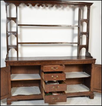 An 18th century oak dresser. Raised on stile supports, the wide body comprising a series of cupboards and short drawers with brass swan neck handles. Above a shaped plate rack of graduating form with flared pediment top. Dismantles into 2 pieces. Measures 209cms high x183cms wide x 53cms depth