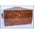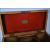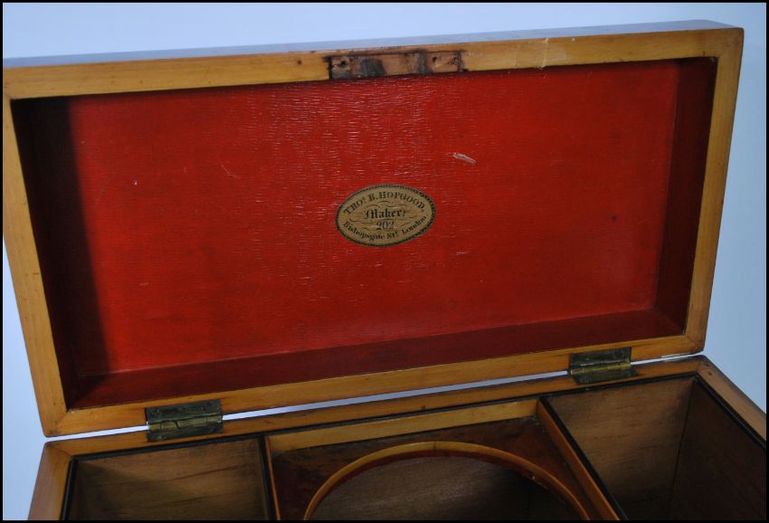 A 19th century George III amboyna wood tea caddy of sarcophagus form with line inlaid details. Raised on brass finial feet with large body, hinged top opening to reveal sectional interior. Finished with brass filt metal ring handles. Measures 31cms long x 19cms high