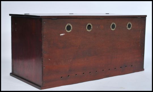 An Edwardian mahogany holy communion priests / vicar's cabinet box. Twin doors with qtr panels having a twin hinged lid opening all to reveal storage within. The sides with pierced holes, vented portholes with mesh to the rear. Measures 30.5cms high x 60.5cms wide x 30.5cms depth