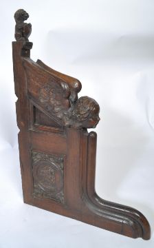 An 18th / 19th century carved oak stairway capital. The heavy carved oak double sided panel with seated lion and shield over winged putti, fielded panels with carved roundel of crusade knight.  Measures 95cms high x 67cms deep