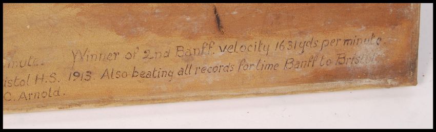 Andrew Beer (1862-1954) An oil on canvas painting depicting two Prize Winning Racing Pigeons winner of 1st Banff 420 miles velocity 1633 yds per minute and OB Challenge Cup and OB average City of Bristol H.S. Owner Mr C Arlond on the left and on the right Winner of 2nd Banff Velocity 1631 yds per minute 1913. Also beating all records fot time Banff to Bristol. Measures 41cms high by 56cms wide.