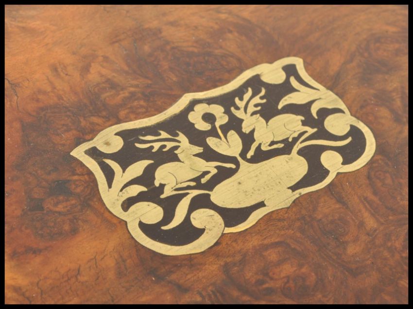 A George III walnut and brass inlaid writing slop box. The top inset with beautiful pierced brass cartouche of stag's opening to reveal a fully appointed sectional interior, red baize slope with glass inkwells. Measures 18cms high x 50cms wide x 26cms depth