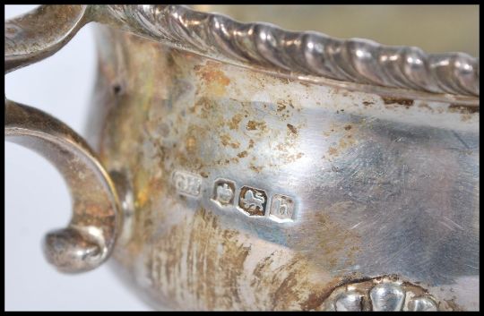 A pair of early 20th century silver hallmarked sauce gravy boats raised on hood feet with acanthus leaf joints. The shaped pouring lip having a beaded border with scrolled acanthus leaf handles. Hallmarked for Sheffield 1925 and 1925 makers Harrison Brothers & Howson ( George Howson ). Weighs together 403 grams. 9cm-high 16cm-wide.