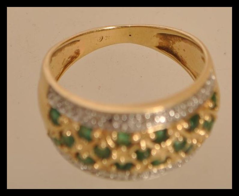 A 14ct gold diamond and emerald ring having three rows of emeralds flanked by two rows of illusion set diamonds. Marked 585. Weighs 3.3 grams. Size I.