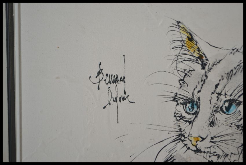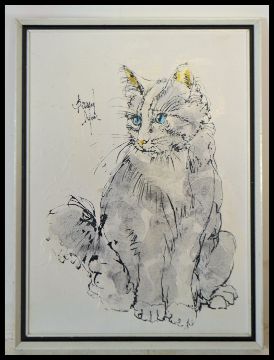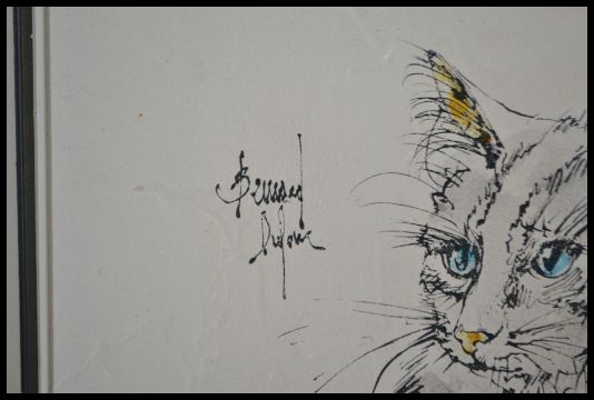 A 20th century painting on board of sitting gray cat with blue eyes, having raised texture throughout, singed Bernard Dufour, set with in a white frame.