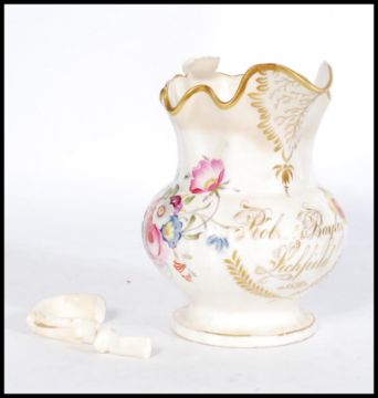 An early 19th century hand painted Staffordshire jug hand painted with floral sprays. Gilt notation to front reading Robert Bayley Lichfield 1839. Measures 16.5cm-high 15cm-wide.