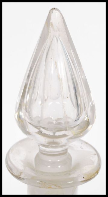 An early 19th Century English heavy cut glass Claret Jug / decanter with fitted stopper, riveted repair to base of handle. Together with two heavy cut glass decanters of similar age. Measures 40cm-high tallest.