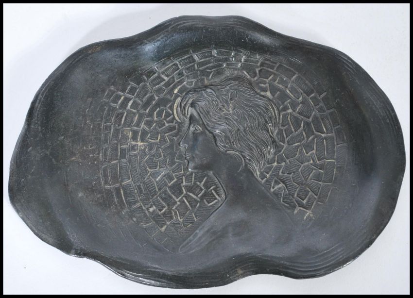 A 19th Century Art Nouveau cold cast metal pin dish, of shaped form with female bust to the centre of the dish, unmarked. Measures 18cm-wide 13cm-deep.