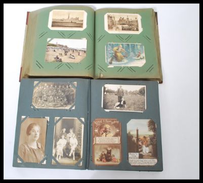 Fabulous family postcard collection; a fabulous original single-family postcard album. Spanning two albums, with some 500+ postcards present. Largely addressed to a ' Mrs Day ' of Leicester, and her related family members. Cards include; humour, WWI First World War, several soldier photographs, children, real photo, greetings cards, artist type, nurses, group photographs, photographs inside a school, views of Melton Mowbray, Royal Engineers Barracks in Chatham, Leicester Band 25A, some early motorcycle interest, some WWI related French views (written from a soldier home), Lytham, Skegness, Coventry, church harvest, Ramsgate, Lowestoft, No.3 Ward Isolation Hospital Leicester, Birmingham, WWI ' German Prisoners At Work ', WWI Aircraft and many others. A wonderful and fascinating collection. Large WWI interest throughout - most appear c1900 - 1930's. Rare. Biggest 29cm-high 23cm-wide.