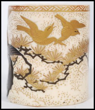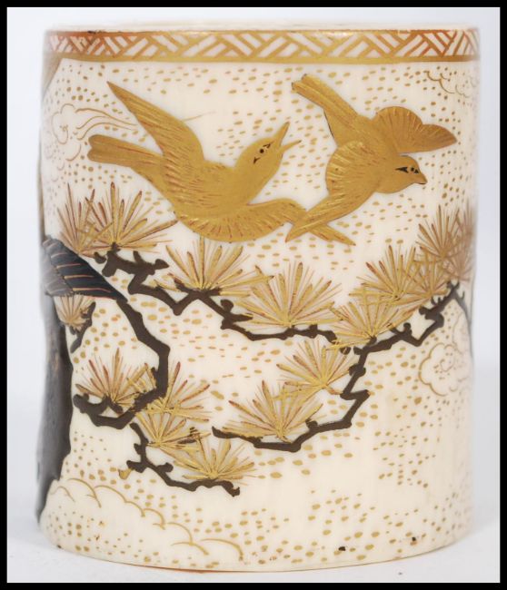 A 19th century Japanese Edo period ivory part vase having gilded and lacquer decoration of eagles and trees. Measures 6.5cm-high 8cm-wide.