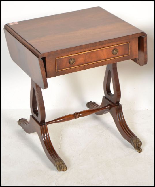 A good pair of Regency revival mahogany drop leaf side / lamp tables, each with single drawers being raised on lyre shaped supports. Measures: 53cm high x 48cm wide x 38cm deep.