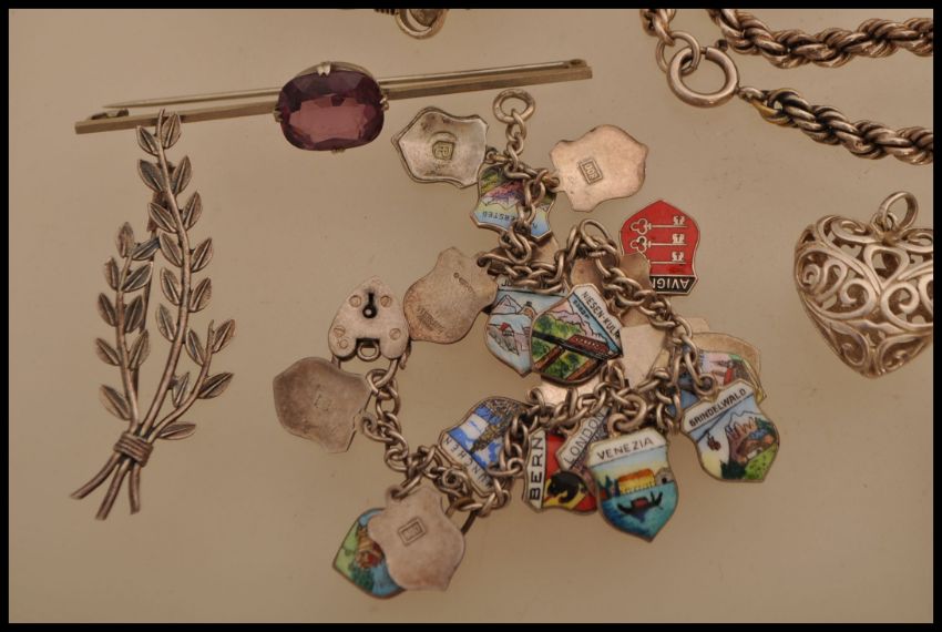 A selection of white metal and silver jewellery to include a souvenir bracelet with enamelled European shields stamped 800 to the backs with a heart lock hallmarked for Birmingham, a stamped 925 silver bird brooch, a floral brooch stamped silver, a three leaf brooch stamped silver to the back, two mother of pearl pendants, a silver white metal ring with a grey stone, a foliate brooch, a white metal anklet with enamelled heart detailing, and a twist rope necklace etc.
