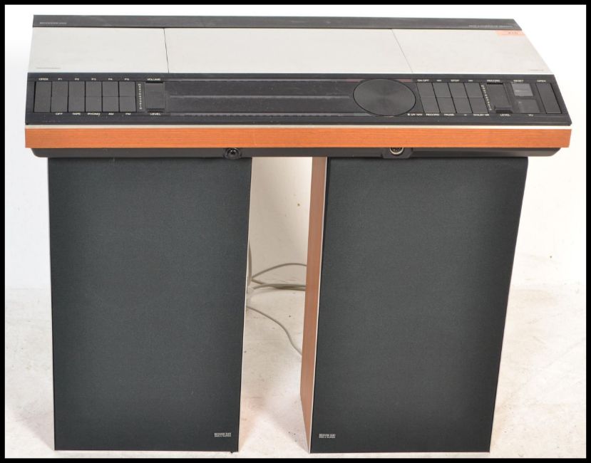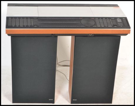 A vintage retro 20th century Bang and Olufsen B&O Beocenter 4000 music system complete with a pair of B&O speakers.