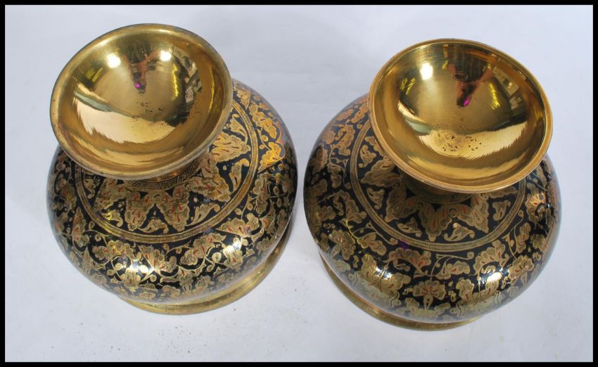 A selection of early 20th century Indian enamelled brass wares to include a pair of bulbous form vases raised on round bases having black and red enamelled naturalistic patterning along with a brass vase with red enamelled foliate and peacock patterning. Measures 21cm-high 29cm-diameter biggest.