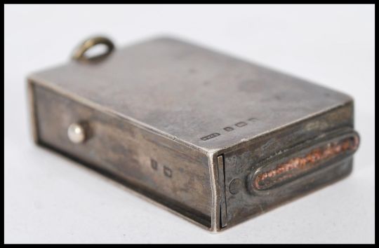 An early 20th century silver hallmarked sprung vesta case in the form of a matchbox with bale loop to top. Hallmarked for Birmingham 1908 makers Matthew Wilcox & Son weighs 41.4 grams. 4.5cm-high 3cm-wide.