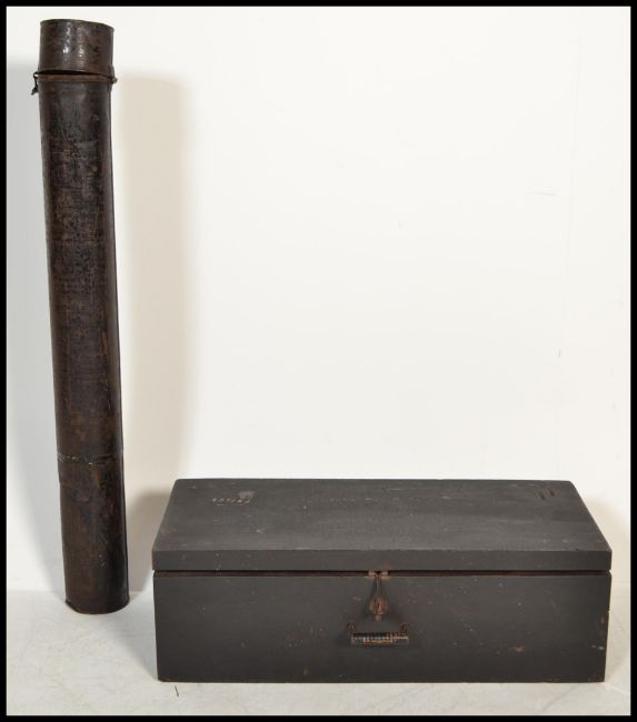 An unusual antique early 19th century surveyors japanned metal instrument holder dated 1804 WHITES SURVEY Dock engineers office Bristol along with a Military uniform box. Measures 26 cm x 77 cm x 25 cm.