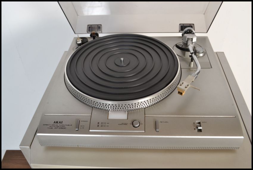 A vintage retro 20th century Akai Hi-Fi music entertainment stacking system consisting of a Direct Drive record player turntable auto-return AP-D30C, Stereo Integrated Amplifier dual power supply AM-U02, FM AM Stereo Tuner AT-K02L and Stereo Cassette Deck CS-M02 along with a pair of Akai speakers.