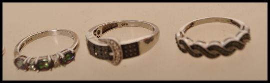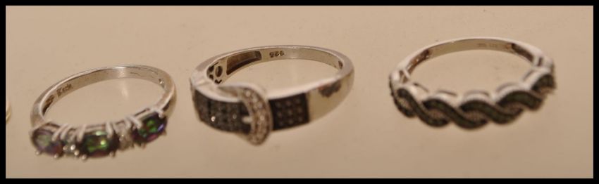 A selection of silver and white metal rings to include a stamped 925 buckle ring with inset black and white stones (size S), a stamped 925 plaited ring with green diamonds (N.5), a stamped 925 cross over ring (size S) and a stamped Karis ring set with three oval cut purple stones with small white accent stones (O.5). Weight 9.6g.