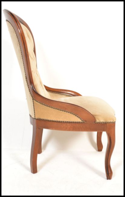 A 20th Century Victorian style spoon back mahogany framed button back upholstered nursing chair,raised on shaped cabriole supports. Measures: 88cm high x 52cm wide x 45cm deep.