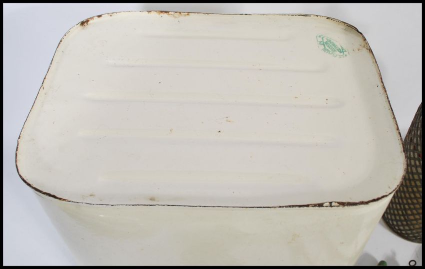 A collection of vintage 20th Century kitchenalia items to include an enamel bread bin and lid with green notation to the front, a stunning mid Century Healacraft food mincer cast from aluminium in the form of a Whale, utensils etc. 33cm-high 39cm-wide.