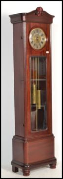 A 1920's large mahogany cased Westminster chiming longcase / grandfather clock. The dome top case with large silvered dial having glass fronted trunk housing weights and chains with box plinth base. Measures: 202cm high x 50cm wide x 30cm deep.
